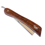 Barbera o navaja para afeitar o razurar en acero de alta calidad en color plata y cabo o mango en madera. De cuchilla intercambiable con sistema tipo mariposa de alta seguridad.